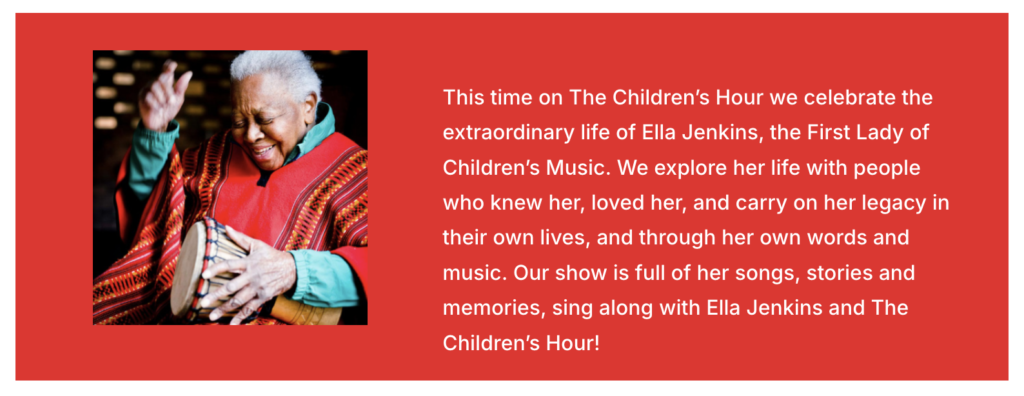 What an honor to be asked to share our love for Ella Jenkins for the Children’s Hour podcast.