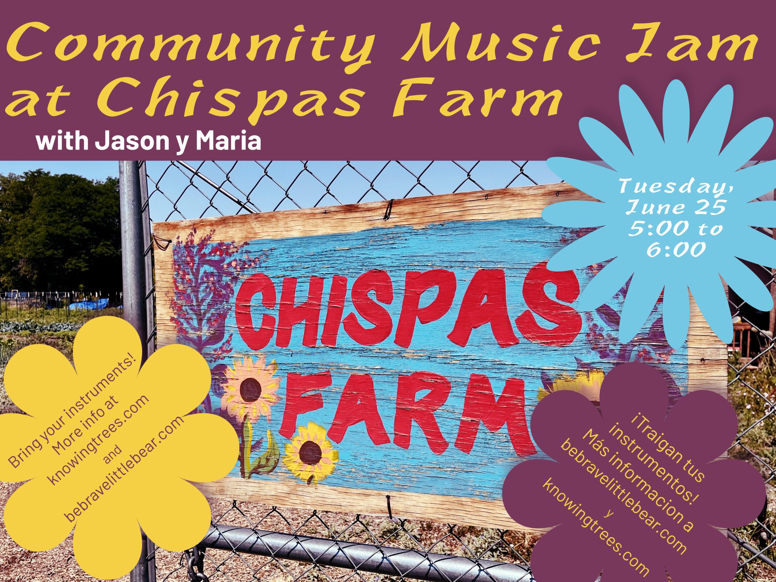 Join our wonderful neighbors Jason and Maria for an afternoon of community-supported music making. All music experience levels, especially beginners, are welcome. Grab your guitars, fiddles, whistles, banjos, trumpets, drums or anything else and join us in the beautiful woodsy at Chispas Farm on August 5! Jason is an educator, musician and visual artist. You can find him at Getting to Know Trees: Creative Inquires with Jason McInnes. knowingtrees.com Stay tuned for upcoming Farmily Music dates and times with Maria. No experience encouraged. All ages. Accessibility: The property has paths covered in wood chips, pretty flat, and very spread out. Once you arrive at the farm, you can park along the Eastside fence, enter through the gate, and make your way to the woods on the northwest corner of the property. 🍆🍅🌶🍆🍅🌶🍆🍅🌶🍆🍅🌶🍆🍅🌶🍆🍅 Únase a los vecinos Jason y María para una tarde de música apoyada por la comunidad. Todos los niveles de experiencia músical, especialmente los principiantes, son bienvenidos. ¡Traigan sus guitarras, violines, silbatos, banjos, trompetas, tambores o cualquier otra cosa y únete a nosotros en la zona bonita boscosa en Chispas Farm el 25 de junio! Jason es un maestro, músico y artista visual. Encontrarlo a knowingtrees.com. Estén atentos a las próximas fechas y horarios de Farmily Music con María. Música comunitaria en la recogida de CSA. No se necesita ninguna experiencia. Todas las edades. Accesibilidad: la propiedad tiene caminos cubiertos de virutas de madera, en su mayor parte planos. Se puede estacionar al lado este de la cerca y entrar por la verja.
