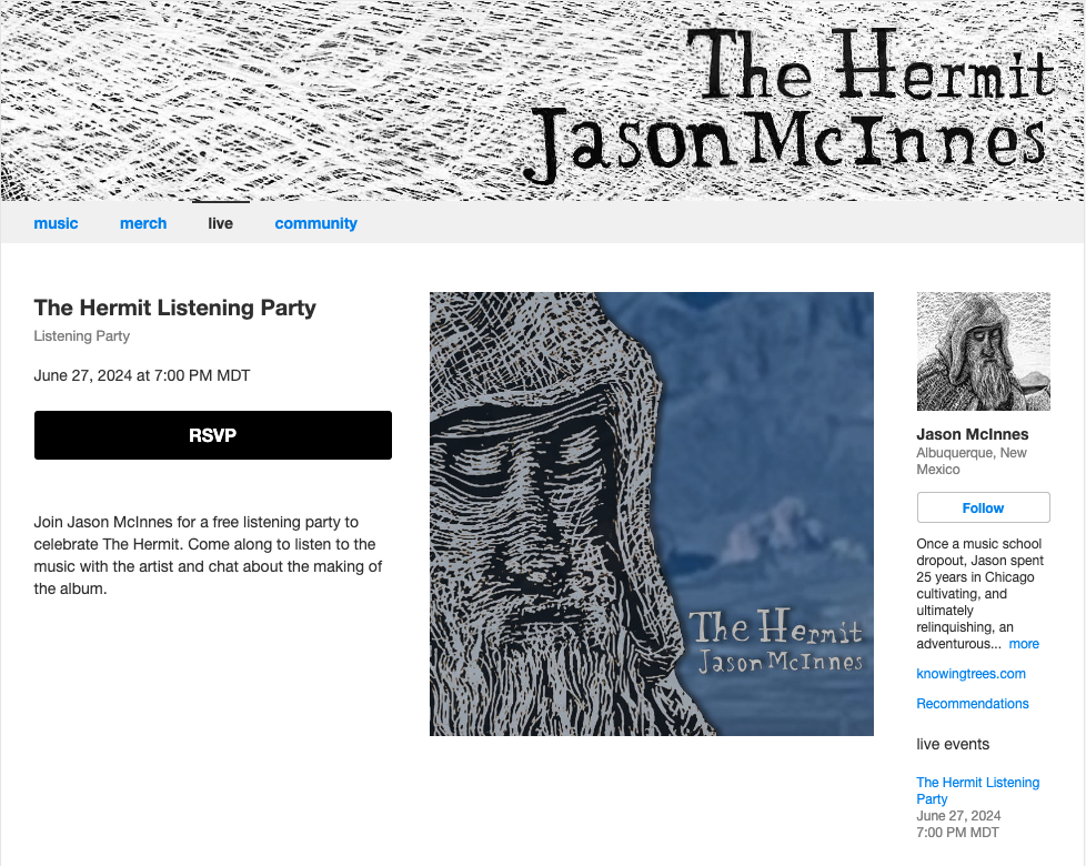 Jason’s new album, The Hermit, will be released on Friday, June 28. But, you can join in a world-wide listening party to celebrate The Hermit the day before. Come along to listen to the music with the artist and chat about the making of the album. Click to RSVP